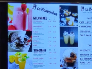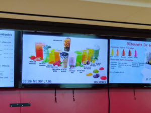 Je vous contacte concernant une situation problématique concernant un de vos commerçants. Je suis déjà intervenu verbalement avec une employée du commerce La Bobonéra pour mentionner que la loi sur l’affichage en français n’était pas respectée et que ça devait être corrigé rapidement. Toutefois, lors de ma dernière visite, j’ai pu constater que le problème n’est toujours pas réglé. Vous pouvez consulter les photos en pièces jointes sur lesquels on peut voir que les noms et les ingrédients des laits frappés (« milkshake ») sont en anglais, l’abréviation pour les format de breuvage sont en anglais (« S, M, L » au lieu de « P, M, G »), ainsi que les garnitures additionnelles (« extra topping »).