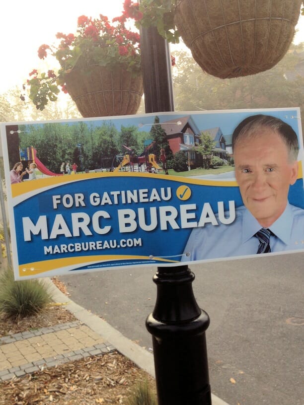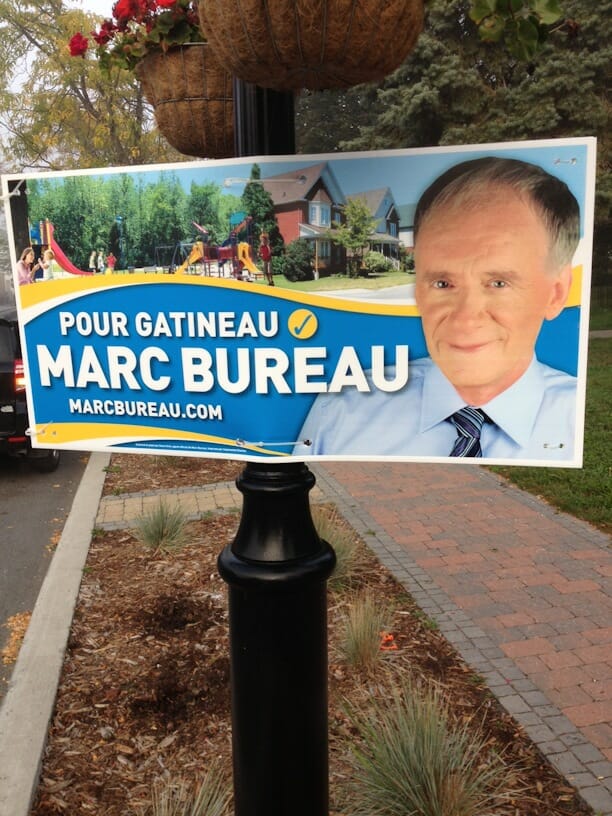 « J’habite le secteur Aylmer. Ce matin, j’ai constaté, en longeant le boulevard Lucerne, qu’environ la moitié des affiches de Marc Bureau sont unilingues anglaises. Pense-t-il sérieusement que les anglophones ne sont pas capables de comprendre un slogan aussi simplet que « pour Gatineau »? Par contre, à Hull, toutes les affiches sont en français. Il s’agit donc clairement d’une campagne axée seulement vers le secteur Aylmer. »