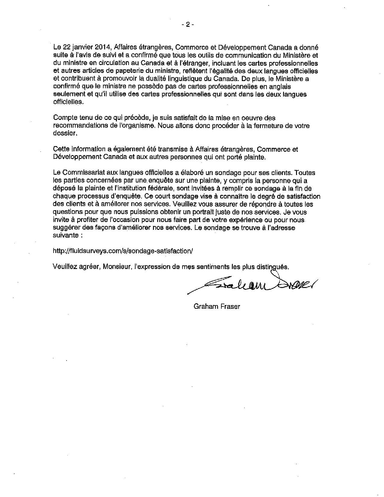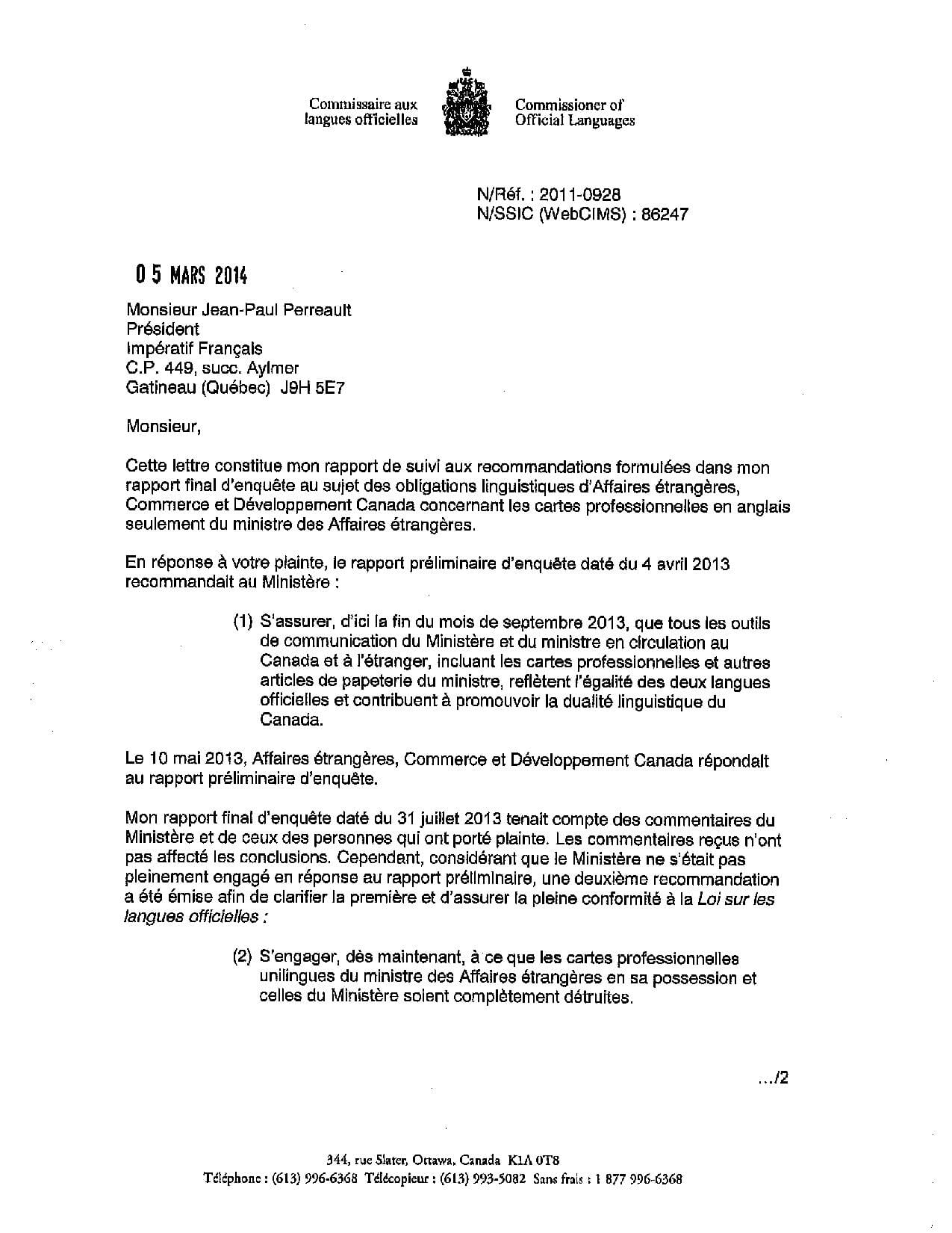 Il aura aussi fallu plus de deux ans pour que le Commissaire aux langues officielles, Graham Fraser, obtienne une réponse de John Baird et plus de deux ans et demi après le dépôt des plaintes, pour que les plaignants apprennent enfin que John Baird avait abandonné cette pratique méprisante (cartes professionnelles unilingues anglaises) d’exclusion ou de suprématie anglophone.