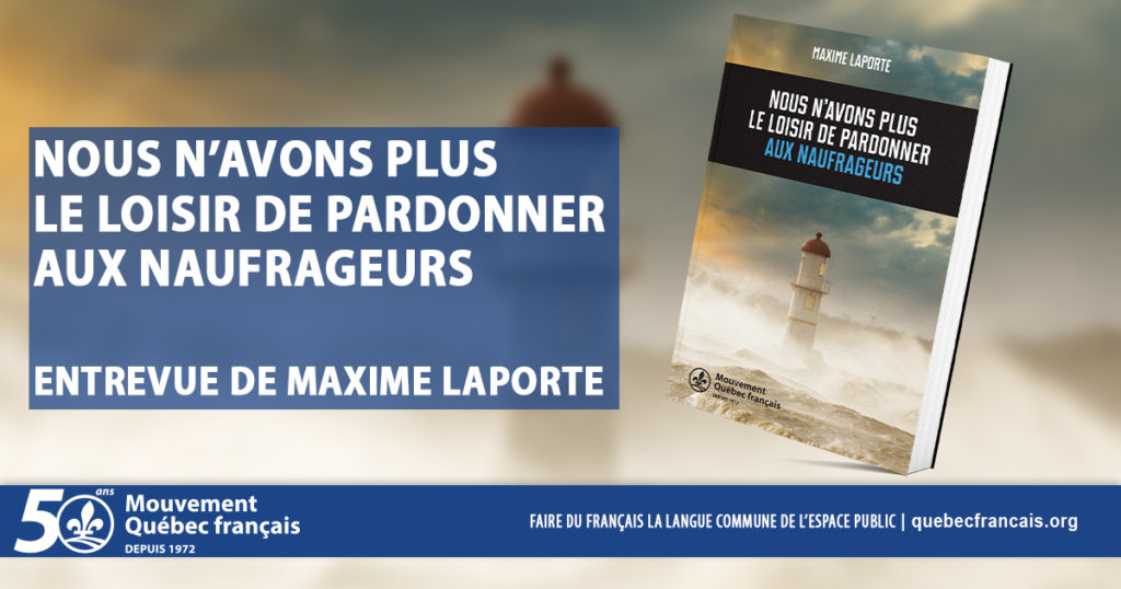 Le Mouvement Québec français (MQF) et sa maison d’édition sont heureux d’annoncer la parution du livre Nous n’avons plus le loisir de pardonner aux naufrageurs de son Président, Maxime Laporte. L’auteur s’interroge sur le déclin accéléré du français au Québec et sur la capacité de nos dirigeants à répondre à la hauteur de l’urgence. Il nous propose le récit poignant des aventures et mésaventures de notre langue au fil du temps et ne négligeant aucun aspect. Aux lecteurs, le Président du MQF pose une question : nos dirigeants sauront-ils déjouer les funestes pronostiques auquel nous condamne la provincialisation de notre nation ?